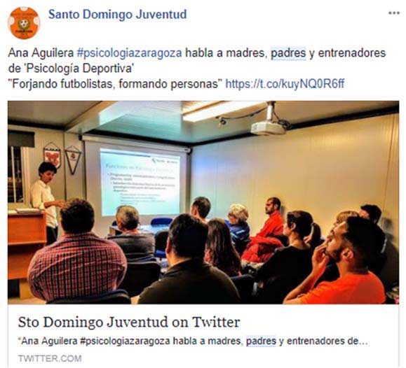 Ya iniciada la temporada, firmamos un convenio de colaboración con el Santo Domingo Juventud. Equipo de referencia en el fútbol base aragonés y actual colaborador para canteras con el Real Madrid CF. Gracias a este acuerdo en psicología deportiva con el Santo Domingo Juventud, realizamos interesantes encuentros con los padres y madres de los jugadores de este club, así como un taller a los entrenadores del mismo.