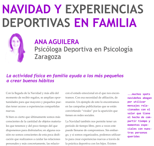 En este caso, siendo el número especial de Navidad, hemos considerado importante poder reflexionar sobre las oportunidades de realizar actividad física en familia para poder crear o potenciar un estilo de vida más activo. Hablamos además de cómo estas actividades de ocio saludable ayudan a cuidar las dinámicas y comunicaciones familiares.